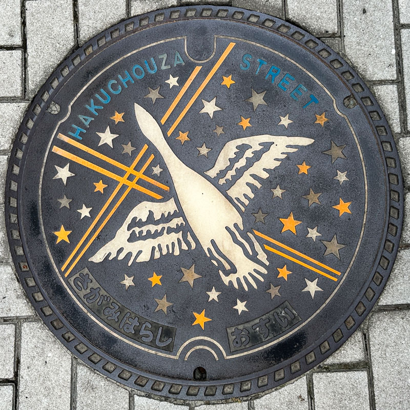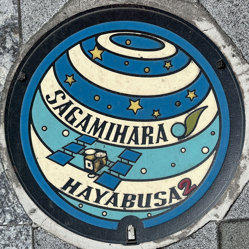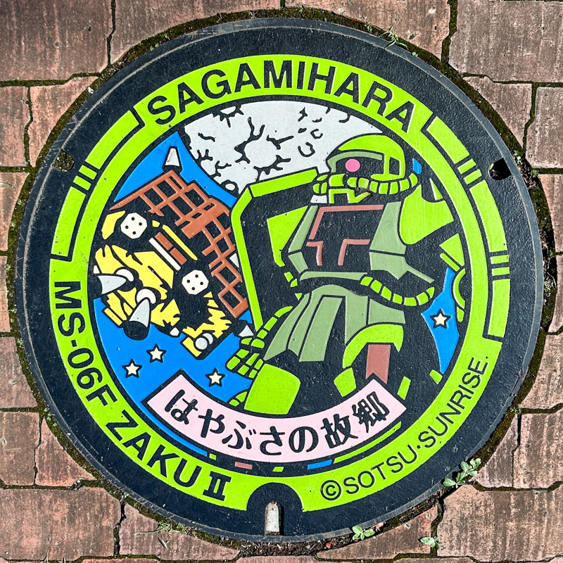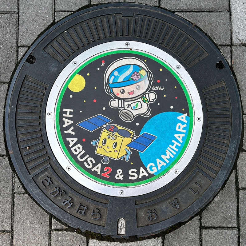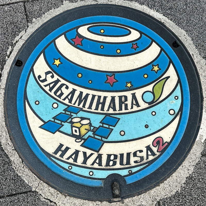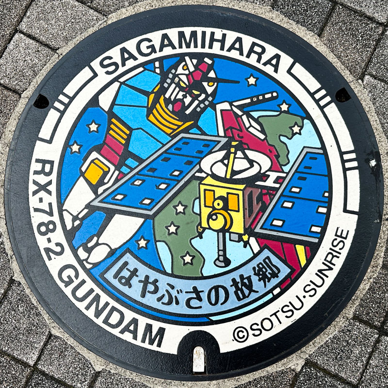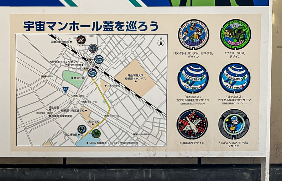 A galaxy panel at Fuchinobe Station (JR Yokohama Line) in Sagamihara, Kanagawa Prefecture. Following the map we found and photographed the Gundam and Hayabusa-themed manhole covers.