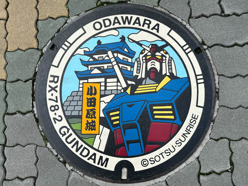 One of the two manhole covers that installed in Odawara City as part of Gundam Manhole Project, a Bandai Namco Group campaign with local governments with the aim to revitalize municipalities nationwide and express the bond that Gundam fans across generations have with the series. The project began in summer 2021 in Odawara, Kanagawa Prefecture, the hometown of Gundam creator Yoshiyuki Tomino.