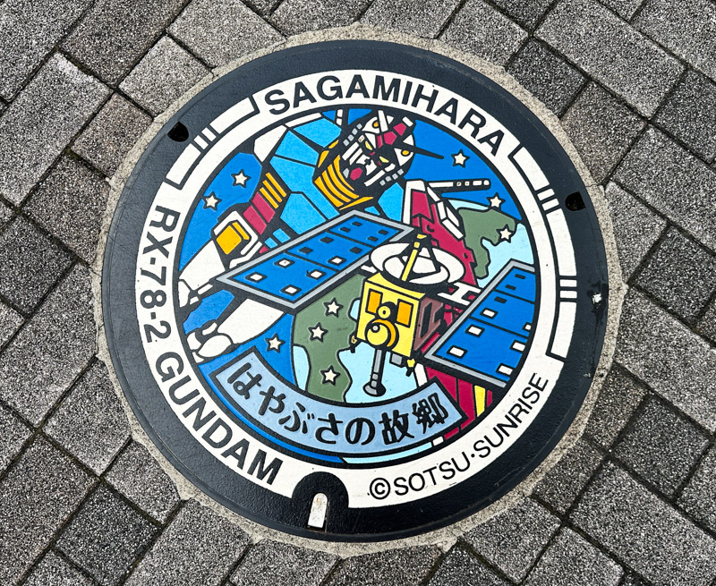 Gundam RX-78-2 and Hayabusa on a manhole cover near Fuchinobe Station in the city of Sagamihara, Kanagawa Prefecture. After Hayabusa capsule was landed in South Australia, it was trasnfered on 18 June 2010 to the curation center in JAXA (Japan Aerospace Exploration Agency) Sagamihara Campus.