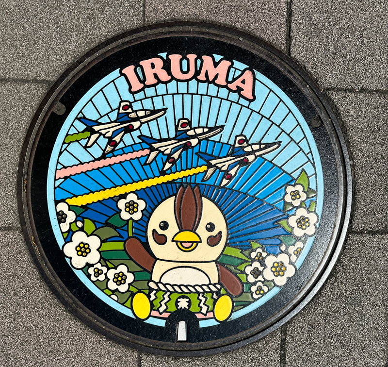 Manhole with design of Iruma City’s (Saitama Prefecture) mascot “Iru-Tea” and airplanes of Blue Impulse, the aerobatic demonstration team of the Japan Air Self-Defense Force (JASDF). This manhole is located at Musashi-Fujisawa Station, Seibu Ikebukuro Line.