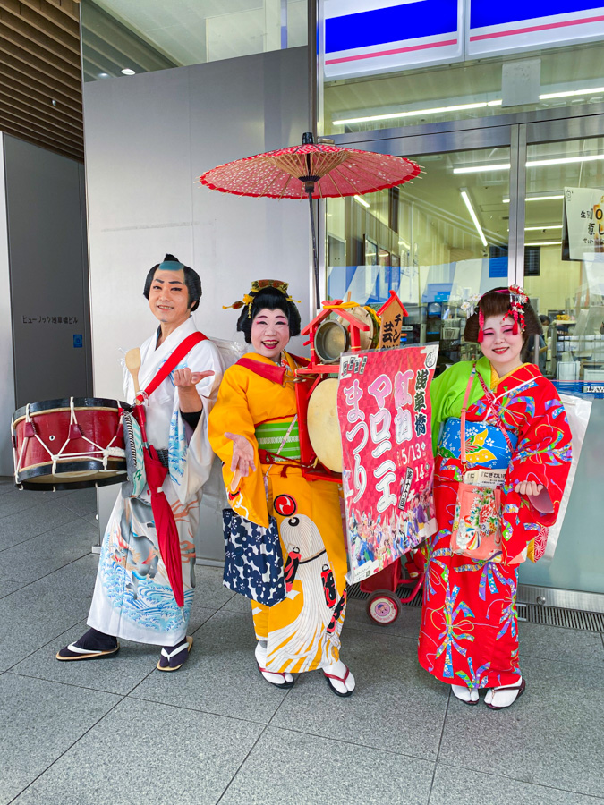 A Chindon’ya (チンドン屋) marching band in Tokyo’s Asakusabashi, promoting the 16th Asakusabashi Kohaku Marronnier Matsuri (Asakusabashi Red and White Horse Chestnut Festival), May 13-14.