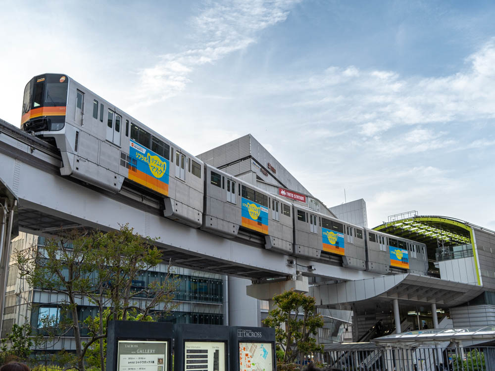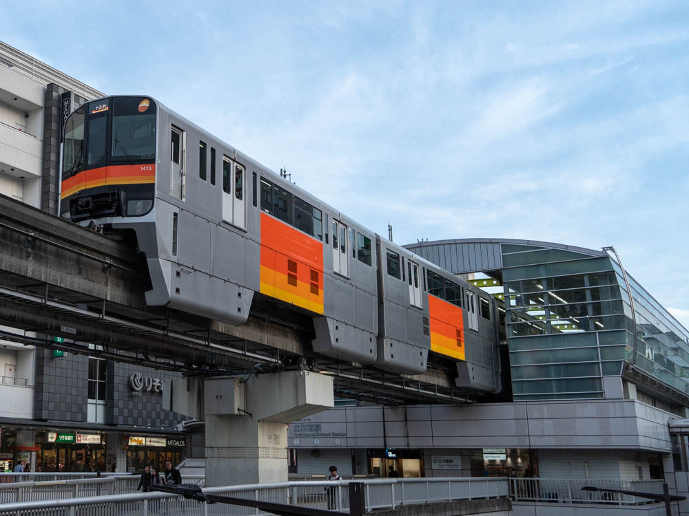 Tama Toshi Monorail Series 1000 sets 1111 and 1413 depart respectively from Tachikawa-Kita and Tachikawa-Minami stations on the Tama Toshi Monorail Line in Tachikawa, Tokyo.